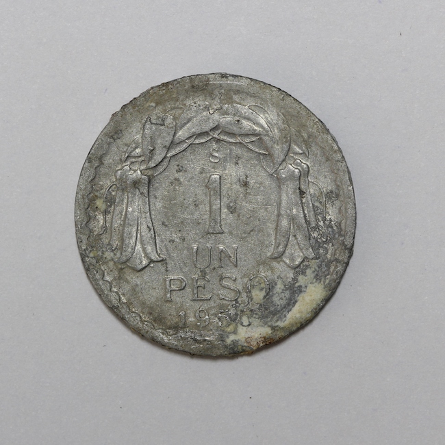 Pieza de forma circular y de color plateado, cubierta por una pátina de color gris, y algunos sectores con una capa de óxido de color blanco. El anverso muestra el busto del prócer a la derecha, y la inscripción perimetral “REPUBLICA-DE CHILE”, y en el costado derecho la leyenda “BERNARDO/ O’HIGGINS”. En el reverso se observa un manto de copihues y al centro la marca de ceca de Santiago, la denominación y año de acuñación: 1/UN/ PESO/ 1955. La gráfila es acordonada y el canto liso; la posición de los cuños es 6:00 h