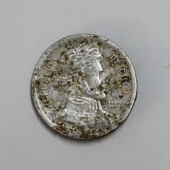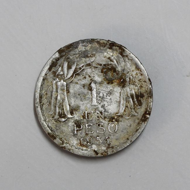 Pieza de forma circular y de color plateado, con restos de sedimentos adherido en ambas caras y focos de óxido en el reverso. El anverso muestra el busto del prócer a la derecha, y la leyenda perimetral “REPUBLICA-DE CHILE”; y al costado derecho la inscripción “BERNARDO/ O’HIGGINS”. En el reverso se observa un manto de copihues y en el centro la marca de ceca de Santiago, la denominación y año de acuñación: 1/ UN/ PESO/ 1954. La gráfila es acordonada y el canto liso; la posición de los cuños es 6:00 h
