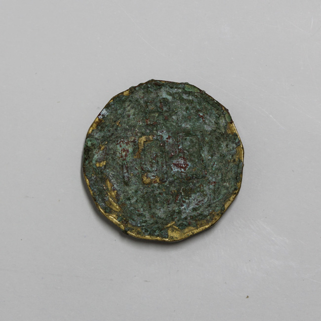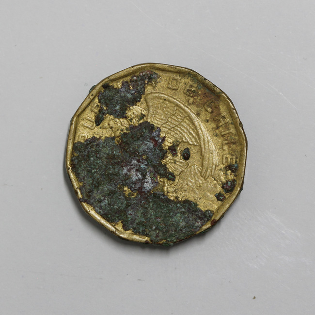 Pieza de forma dodecágona y de color dorado, cubierta en parte por una capa de óxido de cobre. En el anverso se observa la figura de un cóndor a la derecha posado sobre una montaña y con las alza semi desplegadas, y la inscripción perimetral “[RE]PUB[LICA] DE CHILE” En el reverso se observa una corona de laureles y al centro la denominación y año de acuñación: E°/ 100/ 19[74 ó 75]…” La gráfila y el canto son lisos; la posición de los cuños es 6:00 h