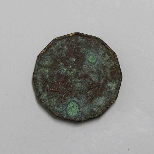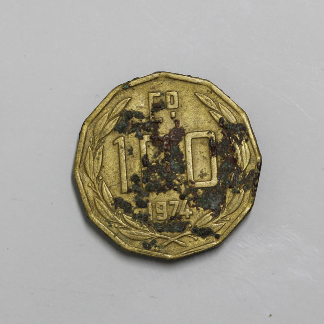 Pieza de forma dodecágona y de color dorado, cubierta en una de sus caras por una pátina color marrón y una capa de óxido. En el anverso solo se distingue la inscripción perimetral “REPUBLICA DE CHILE”. En el reverso se observa una corona de laureles, y al centro la denominación y año de acuñación: E°/ 100/ 1974. La gráfila y el canto son lisos. No se distingue la posición de los cuños.