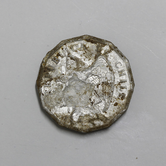 Pieza de forma dodecágona y de color plateado, con faltante en una de sus caras y restos de sedimentos adheridos. El anverso muestra la figura de un cóndor a la derecha posado sobre una roca con las alas semi desplegadas, y la inscripción perimetral “REPUBLICA DE CHILE”. En el reverso se observa una corona de laureles, y al centro la denominación y año de acuñación: 10/ CENTAVOS/ 1978. La gráfila y el canto son lisos. La posición de los cuños es de 6:00 h.