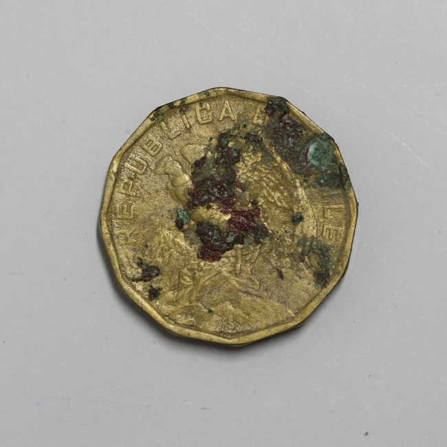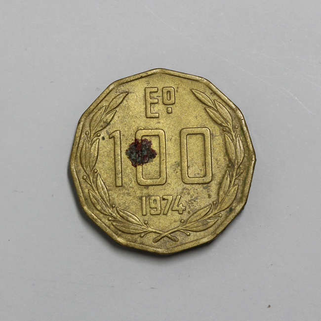 Pieza de forma dodecágona y de color dorado, con restos de óxido en ambas caras. En el anverso se distingue la figura de un cóndor a la derecha posado sobre una montaña con las alas semi desplegadas, y la inscripción perimetral “REPUBLICA DE CHILE”, y en el extremo inferior la marca de ceca de Santiago. En el reverso se observa una corona de laureles, y al centro la denominación y año de acuñación: E°/ 100/ 1974. La gráfila y el canto son lisos. La posición de los cuños es de 6:00 h.