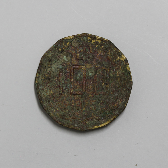 Pieza de forma dodecágona y de color dorado, con restos de óxido en ambas caras y con una capa de pátina marrón en el reverso. En el anverso se distingue la figura de un cóndor a la derecha posado sobre una montaña con las alas semi desplegadas, y la inscripción perimetral “REPUBLICA DE CHILE”, y en el extremo inferior la marca de ceca de Santiago. En el reverso se observa una corona de laureles, y al centro la denominación y año de acuñación: E°/ 100/ 1975. La gráfila y el canto son lisos. La posición de los cuños es de 6:00 h.