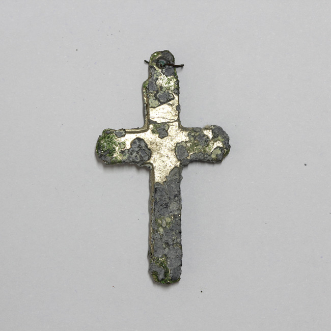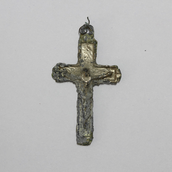 Pieza completa de color plateado cubierta en parte por una capa de óxido, y de forma rectangular. El anverso tiene un reborde perimetral y en sobrerelieve, una figura masculina crucificada cuya cabeza se apoya en el centro del travesaño. En el extremo de la cúspide se encuentra un agujero de sujeción que conserva parte de un eslabón de alambre. El reverso es plano. Es una cruz de tipo latina.
