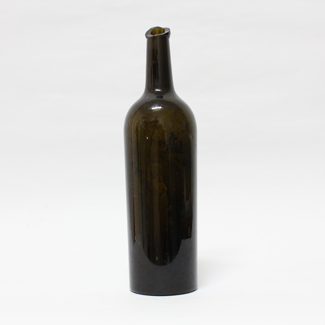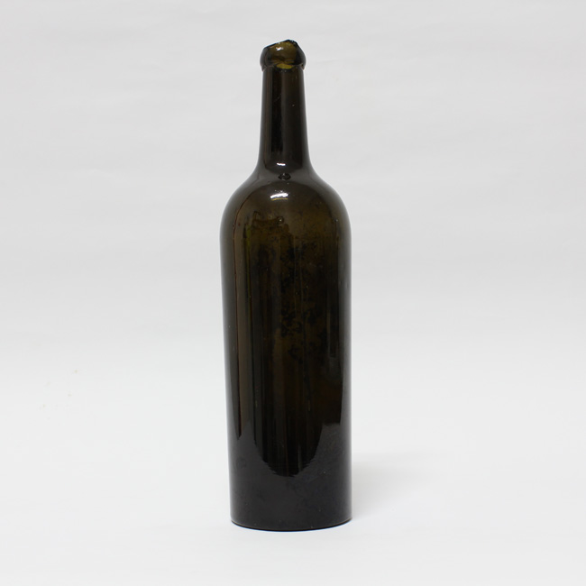Pieza incompleta, con faltantes en el cuello, de color verde oliva y de variedad translúcida. El cuerpo es levemente cónico; los hombros son pronunciados y redondeados; el cuello es cónico y tiene un anillo redondeado; la boca está ausente. La base es cóncava y de borde plano, posee un leve decantador. Se observa una costura irregular en la unión del anillo con el cuello, y dos leves costuras laterales en el cuello. Hay burbujas, corresponde a una botella de tipo jerezana.