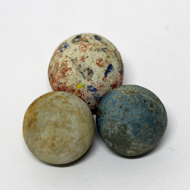 Tres piezas completas y de forma esférica. Una de ellas está pintada de color azul con tonos claroscuros; otra está pintada con manchones multicolores sobre el color blanquecino de la pasta, y tiene la superficie desgastada e irregular. La tercera no está pintada y tiene un color gris claro con tonos marrones., de superficie lisa y con leves faltantes.