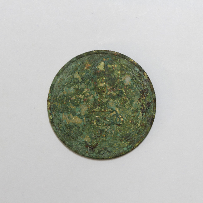 Pieza de forma circular y de color dorado, cubierta en parte por una capa de óxido verde. El anverso muestra el busto del prócer a la derecha y la inscripción perimetral “REPUBLICA- ….CHILE”. En el reverso se observa una corona de laurel y al centro la denominación y año de acuñación: 1/ peso/ 1979. La gráfila y canto son lisos, y la posición de los cuños es 5.00 hrs.