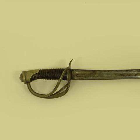 Arma blanca de mano, corto-punzante. Compuesta por empuñadura, hoja y vaina. Empuñadura constituida por pomo de bronce, mango estriado cubierto de cuero con trenzado de bronce. Guardamano que se desprende desde el pomo hasta la cazoleta de bronce. Hoja de acero curvada de un solo filo con vaceo central, terminada en punta redondeada. Vaina de metal curva, con dos abrazaderas en su parte media, ambas rematadas en anillas