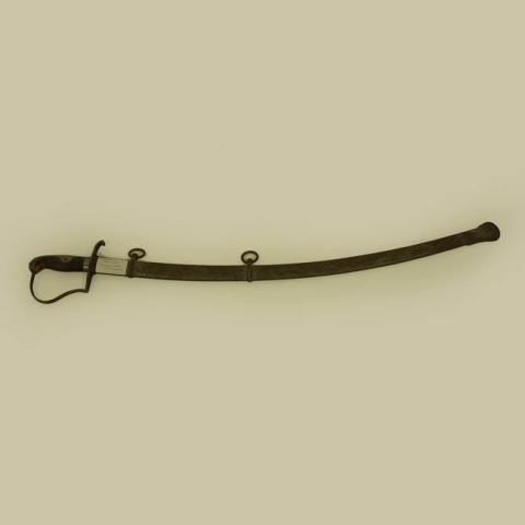 Arma blanca de mano, corto-punzante. Compuesta por empuñadura, hoja y vaina. Empuñadura constituida por pomo, mango de madera recubierto de cuero, estriado. Cruz de acero la cual se une con el pomo formando el guardamano. Hoja curva de un solo filo, con un vaceo central en ambas caras, terminada en punta redondeada. Vaina de metal con dos abrazaderas: inferior y media; ambas rematadas en anillas.