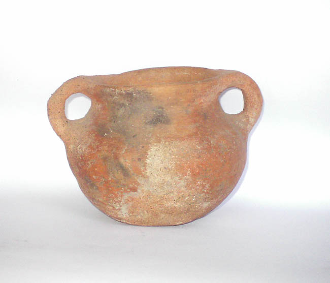 Contenedor restringido de perfil compuesto. Tiene labio redondeado, cuello cóncavo, cuerpo globular y base curva. Tiene dos asas anulares contrapuestas de borde a cuerpo de orientación vertical. Superficie alisada de color anaranjado con manchas oscuras y claras.