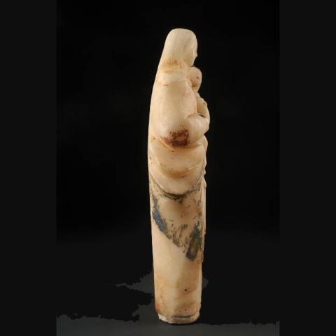 Figura femenina de pie, sostiene a un niño con el brazo izquierdo, mano derecha sobre el pecho sosteniendo la mano izquierda del infante, el manto de la virgen cae en múltiples pliegues, la espalda no está esculpida a pesar de ser una talla exenta.