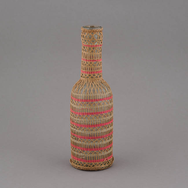 Objeto decorativo. De forma cilíndrica con cuello alargado, elaborada en vidrio, revestida con tejido de trama abierta, decorado con nueve franjas de color fucsia y seis de crin natural sin teñir. Elaborado en una estructura de raíz de álamo sobre la cual pasa el tejido.