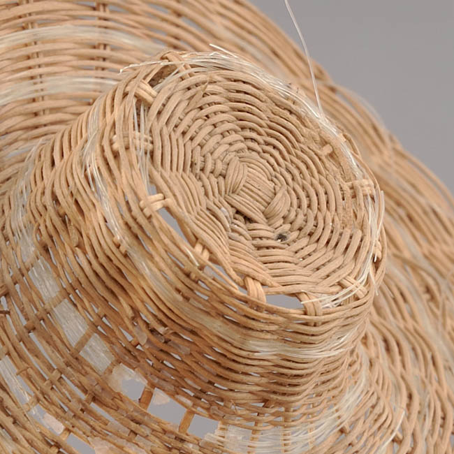 Objeto decorativo. En forma de sombrero de ala ancha y copa media. Decorado con cinco franjas de crin natural sin teñir. Elaborado en una estructura de raíz de álamo sobre la cual pasa el tejido.