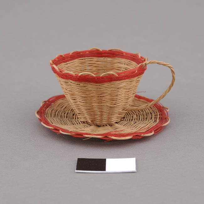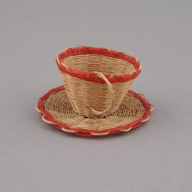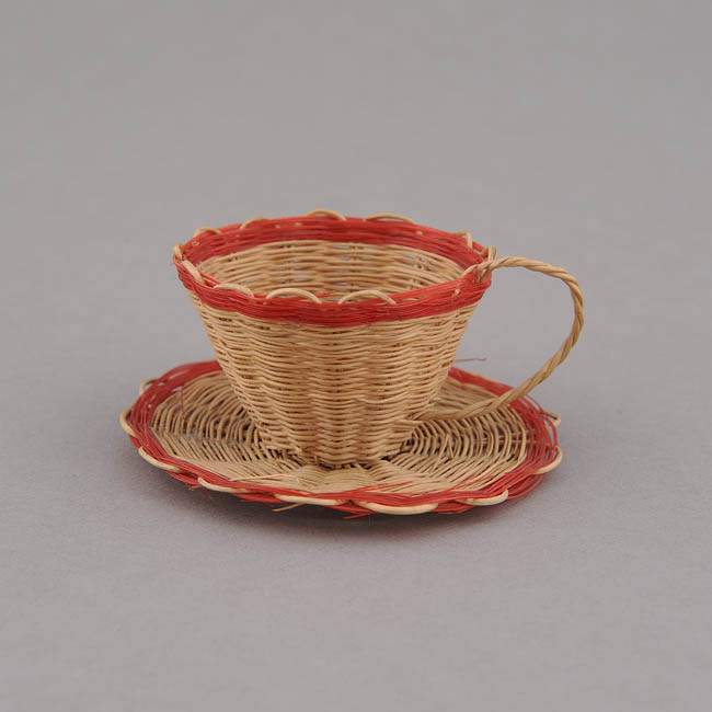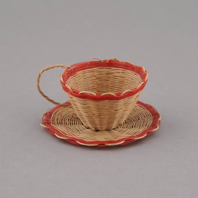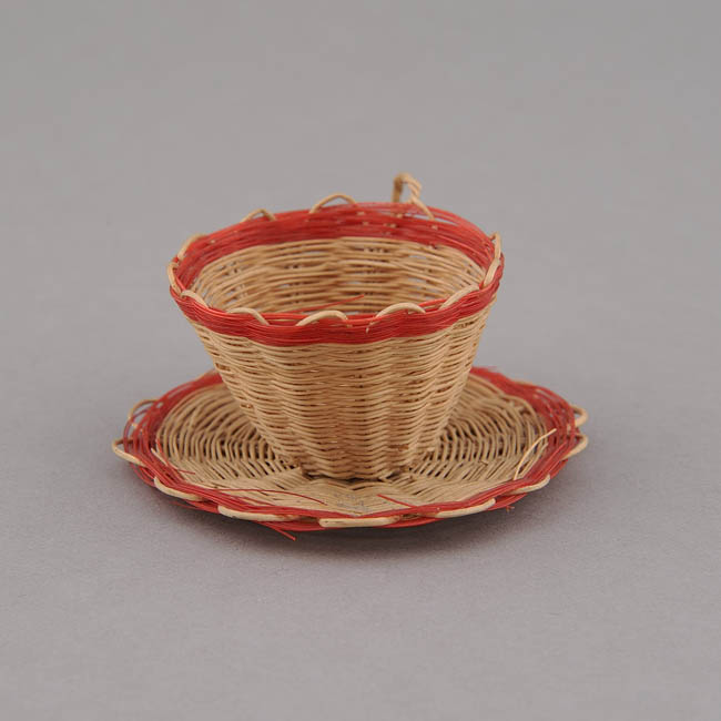 Elemento decorativo. Objeto compuesto por un contenedor trococónico invertido con asa vertical de borde a cuerpo, y sujeto a una base cilíndrica. Representa una pequeña taza con su platillo. Se encuentra fabrica do en fibra vegetal tejida y teñida en los bordes formando una delgada línea de color rojo.