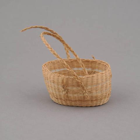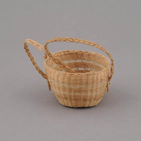 Objeto decorativo. Cuerpo cilíndrico con dos asas trenzadas superiores. Decorado con dos franjas de crin natural sin teñir. Elaborado en una estructura de raíz sobre la cual pasa el tejido.