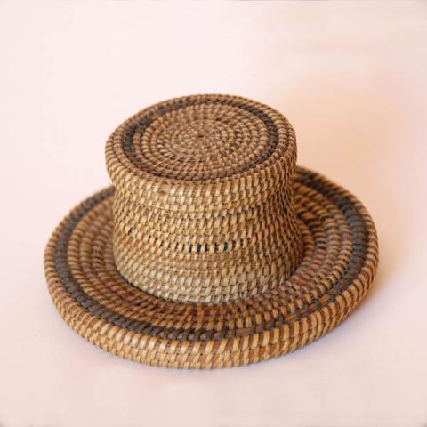 Objeto decorativo. Contenedor de base circular con tapa, desde la tapa mas grande surge otro canasto de menor diámetro también con tapa.