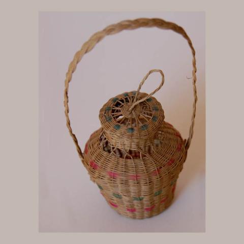 Objeto decorativo. De base redonda, cuerpo cilíndrico y asa trenzada superior. Lleva tapa. Decorado con franjas alternas de color verde, calipso y rosado. Elaborado en una estructura de raíz sobre la cual pasa el tejido.