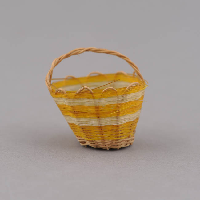 Objeto decorativo. De forma cónica con asa superior. Decorado con tres franjas de color amarillo y dos de crin natural sin teñir. Elaborado en una estructura de raíz sobre la cual pasa el tejido.