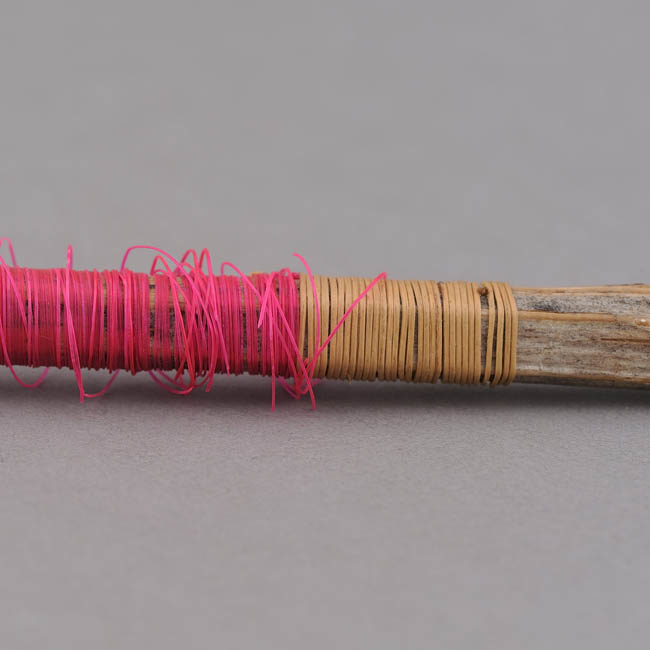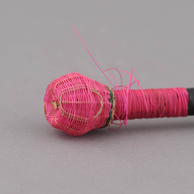 Objeto decorativo. Bastón largo con una figura cónica en un extremo.Está decorado con franjas de color rosado, negro y natural de raíz. Representa una bombilla para usar en conjunto con el mate