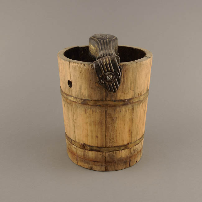 Utensilio usado para la fabricación manual de helados. Objeto compuesto por un balde troncónico invertido de madera que tiene en su interior un recipiente metálico de menor tamaño. En la parte superior, hay un soporte metálico con una manivela que se gira en posición vertical. Madera tallada y pulida de color marrón claro y metal con pátina oscura.