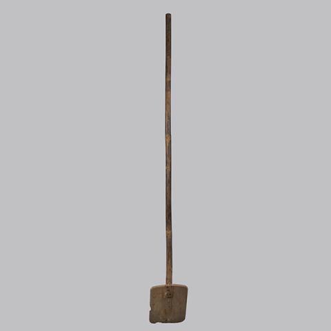 Herramienta usada en las faenas de salineros en Cahuil. Objeto compuesto por un mango cilíndrico y una base rectangular. Madera tallada de color marrón.