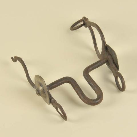 Instrumento de hierro que se usa dentro del hocico del caballo para gobernarlo por medio de las riendas. Es de forma irregular compuesto por una barra de metal de sección circular y dos vástagos ondulados. Del cuerpo penden tres anillos de menor tamaño y tiene dos formas cónicas decoradas con inciso lineal en formas vegetales..
