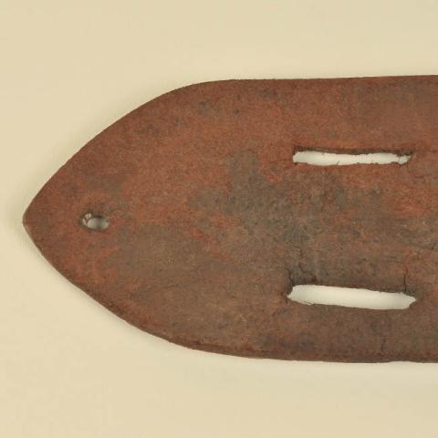Objeto usado para cubrir el filo de un arma blanca. Está compuesto por un extremo triangular y una pieza más ancha y rectangular terminada en punta, que se encuentra perforada con dos agujeros alargados para pasar por ellos el cinturón. Cuero cosido de color marrón rojizo.