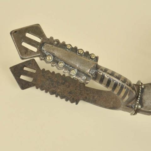 Objeto metálico, que se usa en pares ajustadas al talón del calzado para picar a la cabalgadura. Está compuesto de tres partes: el asta, un arco decorado con franjas negras cuyos extremos terminan de forma de rombo con dos perforaciones rectangulares en cada lado, desde el centro sale el pihuelo, elemento decorado con calados en forma de habichuelas y medias lunas; el pihuelo sujeta la rodaja, de forma circular con veintiocho púas concéntricas, mediante un pasador.