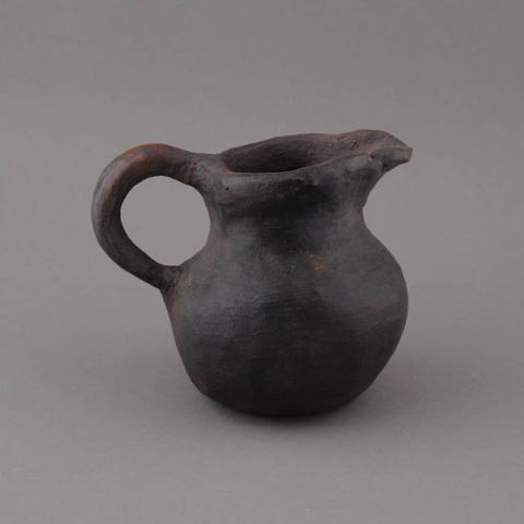 Contenedor restringido de perfil compuesto. Tiene labio redondeado con vertedero, cuello cóncavo, cuerpo globular y base plana. Presenta un asa anular de borde a cuerpo de orientación vertical. Cerámica modelada, alisada y pulida de color marrón oscuro.