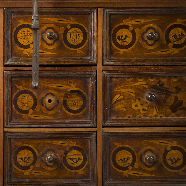 Mueble para lamacenar, de forma cuadrada con tapa superior desplegable y tapa delantera abatible, ambas con sistema de bisagras de fierro, que cubre nueve cajones pequeños. Lleva decoración en taracea con diseño de roleos vegetales y aves y el emblema de la Compañía de Jesús, en la tapa superior decoración con águila bicéfala. Lleva bocallave de fierro y cuatro patas redondeadas.