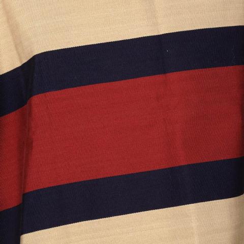 Prenda de vestir de abrigo de uso masculino que se lleva en la parte superior del cuerpo. Textil de forma rectangular con abertura en la parte superior. Se encuentra tejida en bandas intercaladas de color crema y rojo enmarcadas en una ancha línea de color nedro. En todo el contorno le rodea una huincha de color rojo.