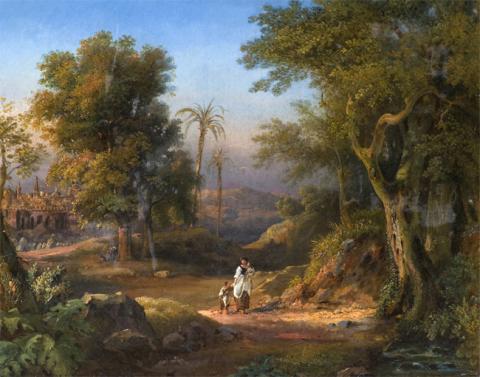 Obra de formato rectangular. Composición en base a paisaje formado por un camino de tierra con una figura femenina y dos figuras de niño al centro de este. A ambos lados gran cantidad de vegetación y árboles. Al fondo, a la izquierda un castillo, montañas y el cielo.