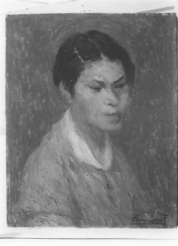 Obra de formato rectangular, vertical. Composición en base a busto retrato femenino de medio perfil. Viste blusa de color verde claro con cuello de color blanco. Tiene cabello corto de color negro. El fondo esta realizado en base a pinceladas de color verde.