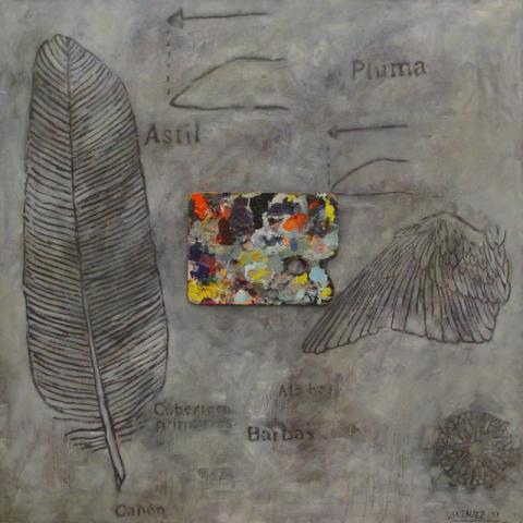 Obra de formato cuadrado. Al centro de la obra un rectángulo pequeño, con un paisaje en tonos sepias alrededor de él cuatro figuras de animales estampadas de color verde claro. El fondo en base a manchas de color verde en diferentes tonalidades, con diseños circulares linéales de color negro.
