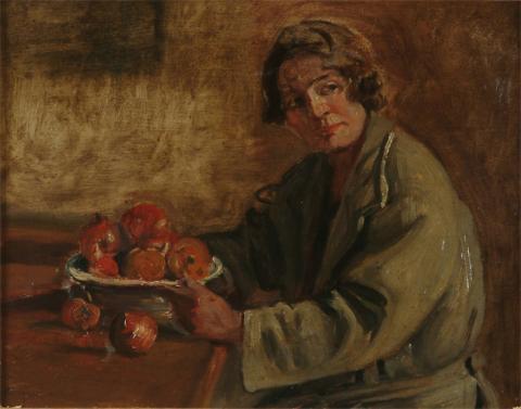 Obra de formato rectangular. Composición en base a figura femenina sedente, de medio cuerpo en medio perfil y cabeza mirando al espectador. Viste abrigo de color verde, de cabello corto de color rubio. Sus manos afirmadas en una mesa de color café, con ellas sostiene una fuente de frutas de color rojo y anaranjado. El fondo plano de color café
