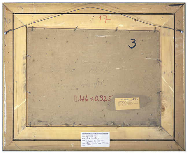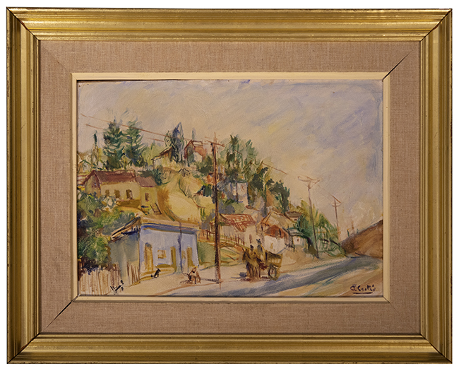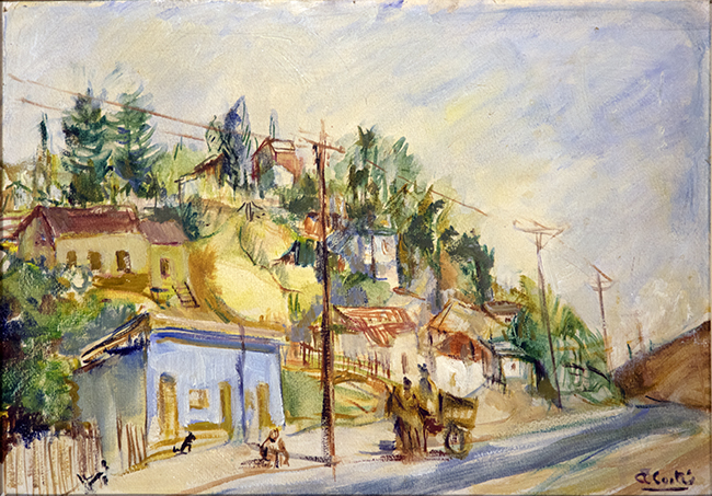 Objeto bidimensional en formato rectangular horizontal. La composición organiza un conjunto de volúmenes arquitectónicos dispuestos sobre una pendiente, definidos por planos rectangulares y líneas inclinadas. En el plano inferior se representa una vía diagonal con un conjunto de formas que corresponden a un vehículo de tracción animal y dos figuras humanas esquematizadas. Se incorporan elementos lineales verticales y horizontales que estructuran el espacio. La zona superior contiene trazos irregulares que delimitan masas vegetales y un fondo atmosférico continuo.