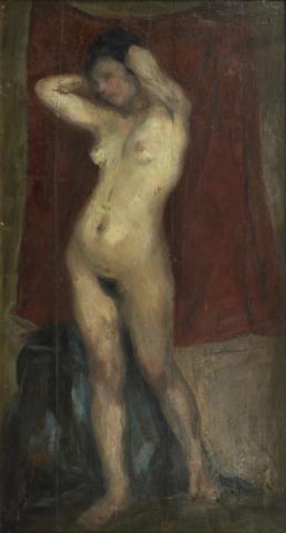 Obra de formato rectangular. Composición en base a desnudo femenino de pie, de cuerpo entero, de medio perfil.