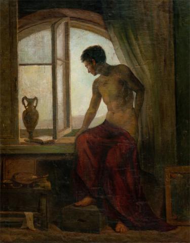 Obra de formato rectangular. Composición en base a desnudo de figura masculina sedente, de cuerpo entero, de perfil. Lleva paño de color rojo el cual cubre su regazo.