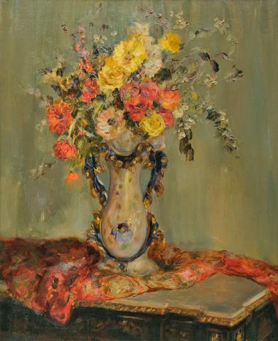 Obra de formato rectangular. Composición en base a figura central de la cual emergen flores de color amarillo, naranja, verdes. De fondo verde.