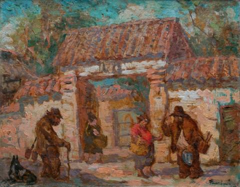 Obra de formato rectangular. Composición en base a paisaje rural. De izquierda a derecha una figura masculina de pie se apoya en un bastón. En segundo plano una figura femenina, lleva un canasto y viste una blusa roja y falda gris. A su lado una figura masculina, viste un poncho y pantalón marrón, camisa beige y sombrero marrón. En la mano izquierda sostiene un canasto. Al fondo, una construcción de ladrillos y tejas. Al fondo una figura femenina, cruza el portón.