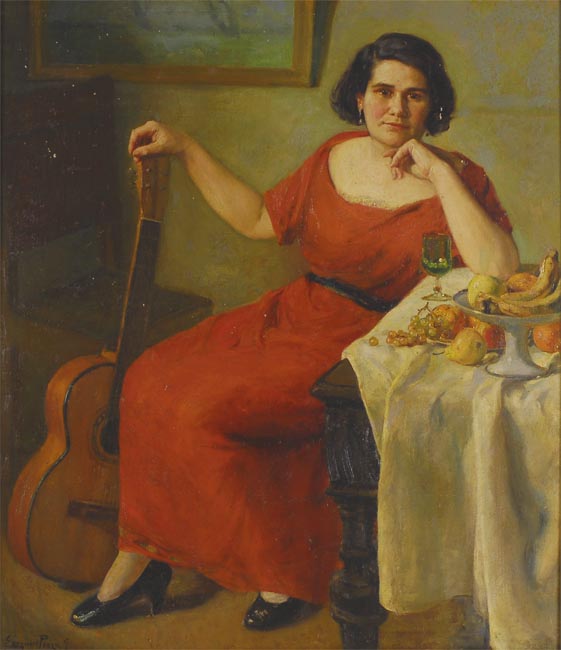 Obra de formato rectangular. Composición en base a retrato de figura femenina, de cuerpo entero, sedente. Lleva vestido de color rojo y un cinturón de color negro. En su mano derecha sostiene una guitarra, el codo del brazo izquierdo apoyado sobre una mesa y con la mano sujeta su mentón.