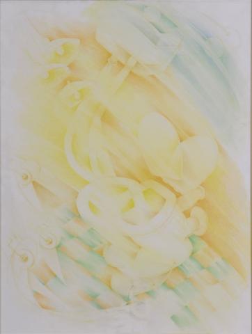 Obra de formato rectangular. Composición en base a inodoro, las diferentes partes se encuentran separadas dentro de la composición de la obra. En la zona superior el estanque, a la derecha la tapa del artefacto. el piso es de color verde, amarillo y blanco. En la esquina inferior izquierda se encuentran dos rollos de papel higiénico con su soporte respectivo. El color de fondo de la obra es el blanco del papel, destacando la figura principal a través del color amarillo. E la zona inferior (piso) como en la superior se encuentra el color verde.