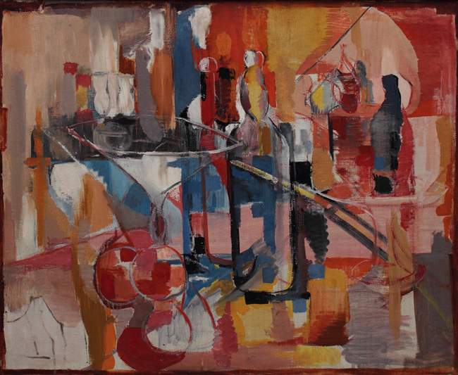 La obra presenta un formato rectangular horizontal. La composición está construida a partir de superposiciones de planos, figuras geométricas irregulares y manchas cromáticas. Predomina una estructura fragmentada, donde diversos elementos se entrecruzan mediante líneas, bloques de color y transparencias.