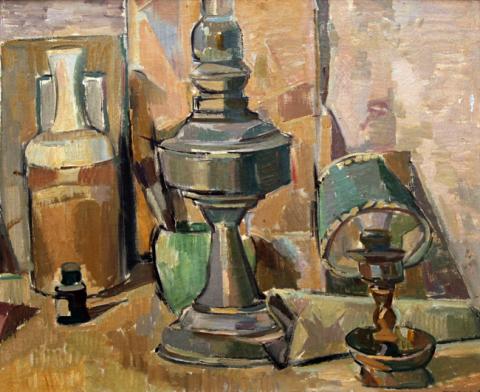 Obra de formato rectangular. Composición en base a figura principal de una lámpara de aceite de color gris. A la izquierda una botella y una figura circular de la cual emergen pinceles. A la derecha una lámpara de color dorado con pantalla de color verde. El fondo formado por manchas de colores beige, ocres y café.