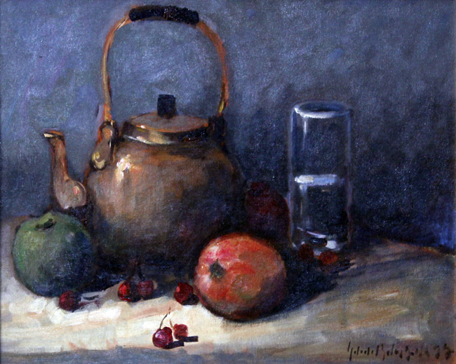Obra de formato rectangular. Composición en base a la figura principal de una tetera de color dorado y gris. A la izquierda una fruta de color verde, a la derecha una fruta de color naranja y un vaso. El fondo plano de color azul.