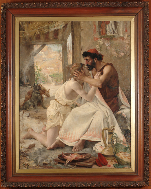 Obra de formato rectangular. Composición en base a escena interior. En primer plano a la derecha se observan diversos utensilios, en forma de bodegón. En segundo plano las figuras principales, dos hombres, uno de ellos ubicado a la derecha de la composición, esta sedente, la cabeza en perfil y el cuerpo en medio perfil. El otro está arrodillado a los pies del primero. La figura sedente viste túnica de color rojo y un paño de color blanco con los bordes en color damasco, el que cubre su hombro derecho, tiene barba abundante, de cabello corto de color negro, sobre su cabeza lleva un Kipà de color rojo, e inclina su cabeza hacia la frente del segundo hombre y con sus manos sostiene la cabeza de este. El segundo hombre está arrodillado a los pies del hombre sedente, está de perfil. Lleva túnica de color blanco con un lazo a la cintura de color dorado. De piel muy blanca, y cabello corto de color rubio. Sus manos están levantadas hacia el rostro del hombre sentado. En tercer plano a la derecha una pared, con una repisa sobre la cual se observan dos esculturas, una de color terracota y la otra de color blanco. En el mismo plano a la izquierda dos perros sentados, uno de color grisáceo y el otro café claro. Al fondo una entrada por la cual se observa un paisaje rural de una plantación, con un camino hacia una montaña.