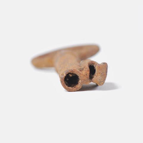 Llave tubular corta, extremo proximal tiene empuñadura grande, tubular, de forma ovalada deformada. Tija con 2 elementos anulares lisa y abierta en extremo distal. Tiene paletón de forma rectangular, ancho y corto, con una muesca deformada, paralela a la tija que lo divide en dos secciones. De color café anaranjado con variación de color.
