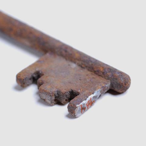 Llave tubular alargada, extremo proximal tiene empuñadura oval tubular de tamaño regular en proporción a su cuerpo que esta fracturada. Tija lisa y cerrada en extremo distal. Tiene paletón recto, ancho, rectangular con muescasdos muescas y diseño en escalera. De color café anaranjado con variación de color.