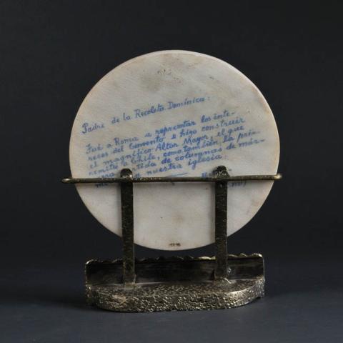 Volumen circular gris, al centro tiene retrato de personaje masculino de rostro bien definido, aspecto mayor, lleva un solideo. Borde rodeado con inscripción bajo relieve que identifica al personaje. Ubicado sobre peana de fierro de rectángular. Parte posteror plana y con inscripción manuscrita en tinta azul.