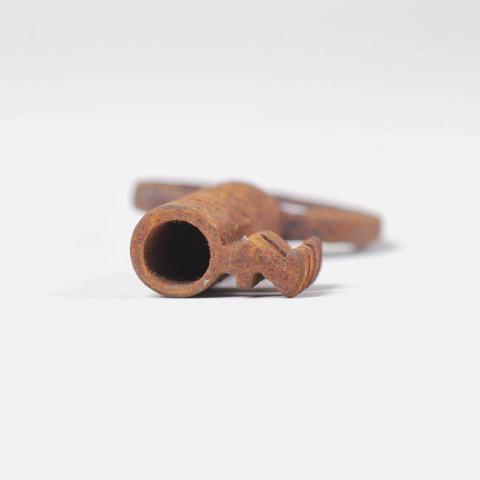 Llave tubular corta, extremo proximal tiene empuñadura grande, plana, de forma ovalada. Tija gruesa y lisa. Tiene paletón de forma rectangular, ancho y bifurcado, con 2 dientes, cada uno con una muesca pequeña en zona media. Tiene ranura paralelo a la tija. De color café anaranjado con variación de color.